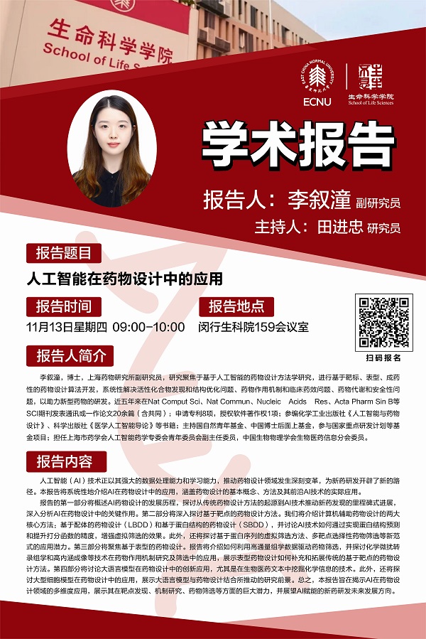 李叙潼,博士,上海药物研究所副研究员,研究聚焦于基于人工智能的药物设计方法学研究,进行基于靶标、表型、成药性的药物设计算法开发,系统性解决活性化合物发现和结构优化问题、药物作用机制和临床药效问题、药物代谢和安全性问题,以助力新型药物的研发。近五年来在Nat Comput Sci、Nat Commun、Nucleic Acids Res、Acta Pharm Sin B等SCI期刊发表通讯或一作论文20余篇(含共同);申请专利8项,授权软件著作权1项;参编化学工业出版社《人工智能与药物设计》、科学出版社《医学人工智能导论》等书籍;主持国自然青年基金、中国博士后面上基金,参与国家重点研发计划等基金项目;担任上海市药学会人工智能药学专委会青年委员会副主任委员,中国生物物理学会生物医药信息分会委员。