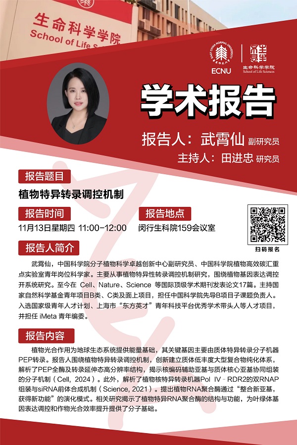武霄仙,中国科学院分子植物科学卓越创新中心副研究员、中国科学院植物高效碳汇重点实验室青年岗位科学家。主要从事植物特异性转录调控机制研究,围绕植物基因表达调控开系统研究。至今在 Cell、Nature、Science 等国际顶级学术期刊发表论文17篇。主持国家自然科学基金青年项目B类、C类及面上项目,担任中国科学院先导B项目子课题负责人。入选国家级青年人才计划、上海市“东方英才”青年科技平台优秀学术带头人等人才项目,并担任 iMeta 青年编委。