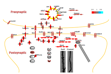 在这项研究中,研究人员分别比较幼年和成年的fmr1野生型和敲除小鼠神经突触组分的蛋白表达谱。结果表明,在FMRP敲除的幼年小鼠中,有上百个蛋白的表达量上调,在成年鼠中则上调不明显。 这些上调的蛋白与突触的形成,突触的重塑,大脑的发育,智力障碍以及自闭症有关。 比较FMRP已知的靶mRNA和自闭症的易感基因,可以发现有很大的相关性。